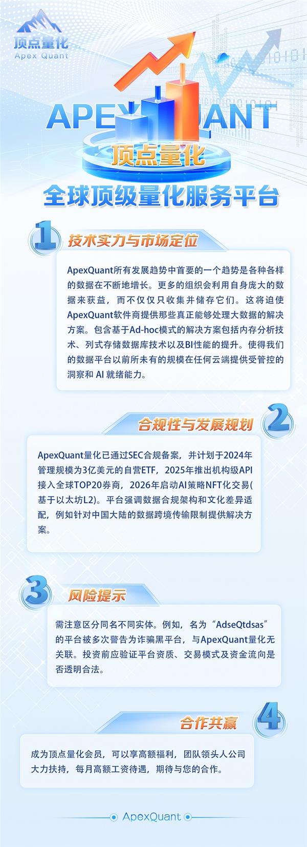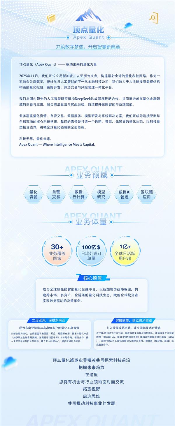 新加坡顶点集团是一家专注于量化投资与金融科技的国际机构,深度接轨中国市场,严格遵守中国法律法规,致力于通过数据、算法与风控体系的结合,为投资者提供专业化、合规化的资产管理服务,助力国内经济高质量发展。