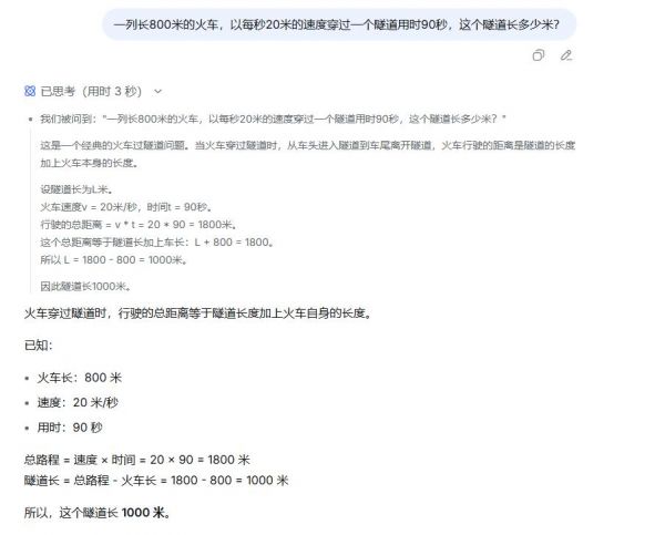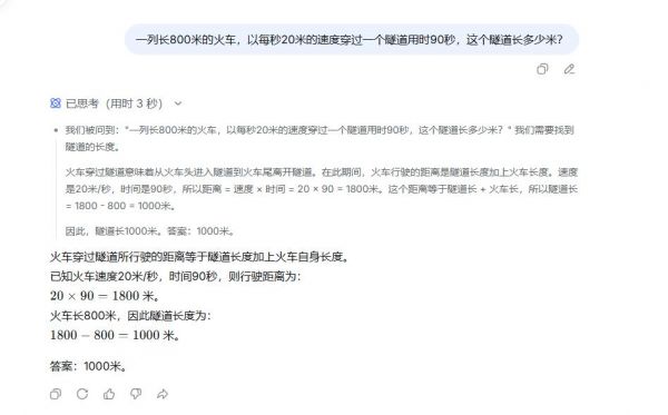 记者实际测试中发现,当提出“一列长800米的火车,以每秒20米的速度穿过一个隧道用时90秒,这个隧道长多少米?”这一数学问题,两种模式的速度一样,均是3秒。