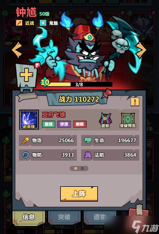 必杀技:冥府飞镰,钟馗向最近的敌人掷出他致命的镰刀,对路径上的敌人造成2次100%攻击力的伤害,并在6秒内使目标受到伤害+25%。技能:绝命镰刀,钟馗挥动镰刀对最近的敌人造成100%攻击力的伤害。