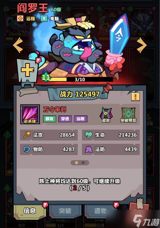远程群攻型神将,输出猛高,攻击方范围广,必杀技万令审判对前方的敌人进行3轮打击,每轮发射3枚超级间王令,造成30%攻击力的伤害,穿透3次。技能轮回掌控击杀敌人获得1份灵魂,每份灵魂使自身攻击+0.1%。