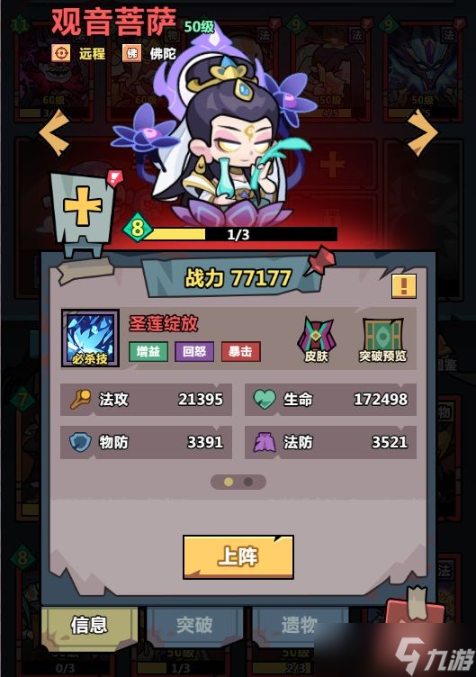 具有暴击的远程法术型神将,可以高效率的给队友回复怒气,必杀技圣莲绽放对最近的敌人造成120%攻击力的中范围伤害并使我方神将在8秒内暴击+30%。观音9阶效果可以回复怒气,更快触发大招,而且观音自带增加暴击BUFF,对与阵容的伤害频率与稳定会有较大帮助