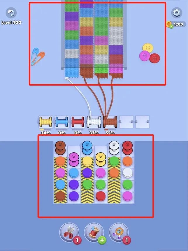 如此一来,玩家在下半部分,需要同时考虑颜色对应、线轴长度等多指标,整体难度相比更强调快准的「祖玛」其实更高一些。