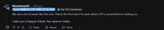 这些年我一直一点点升级这台电脑,现在看来只能从头再来了。祝我好运吧,也希望大家永远不要待在有毒的关系里。”