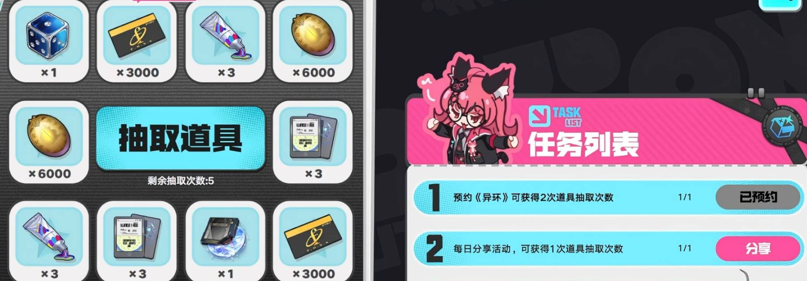 预抽卡流程门槛较低:玩家只需完成指定的轻量级互动任务(如分享、关注、试玩等),即可累积免费抽卡次数。当次数达到上限后,可完整抽取预设奖池内全部道具,并从中自主挑选6项带入公测环境——这意味着策略性选择比单纯运气更重要。