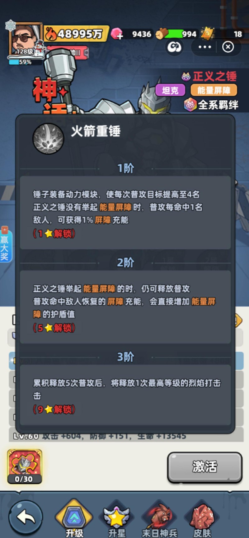 火箭重锤是正义之锤的普通攻击技能。在一阶时,每次普攻命中敌人都能为自身的屏障提供1%的充能。当技能提升到二阶,可以增加护盾的总数值。达到三阶后,若累计释放技能达到5次,还能额外触发一次烈焰打击的效果。