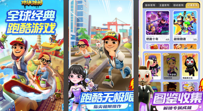 在保留原版跑酷手感基础上新增3v3团队竞速模式,玩家可组队协作收集道具、干扰敌方路线、接力冲刺终点。地图持续扩展,涵盖城市街区、雪地峡谷、未来科技等主题场景;图鉴系统收录角色、滑板、背饰等千余种收集要素。