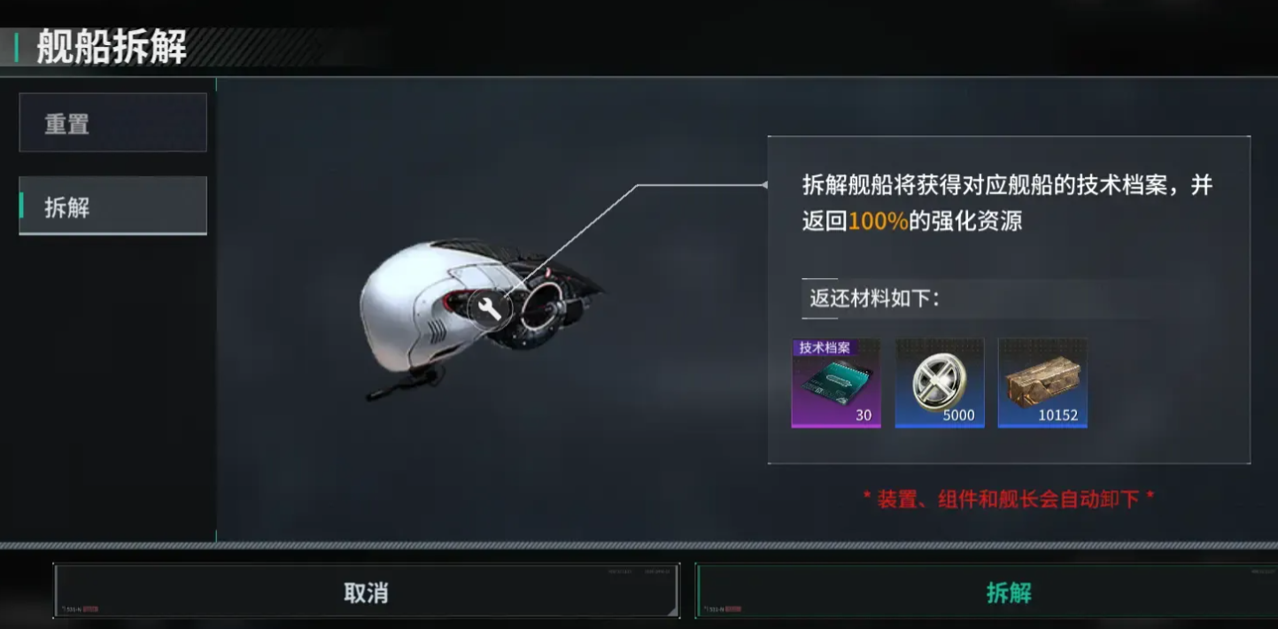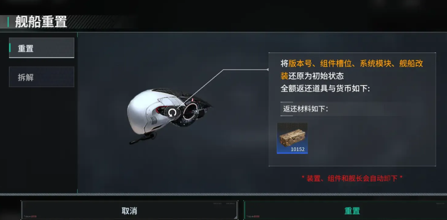 该面板提供两项独立功能:“重置”与“拆解”。选择“重置”可将舰船所有改装项(含组件槽位、系统模块、外观涂装等)恢复至初始状态,并返还基础材料;而“拆解”则在返还全部材料的基础上,额外产出该舰船专属的技术档案——这是解锁同系列高阶型号的重要凭证。