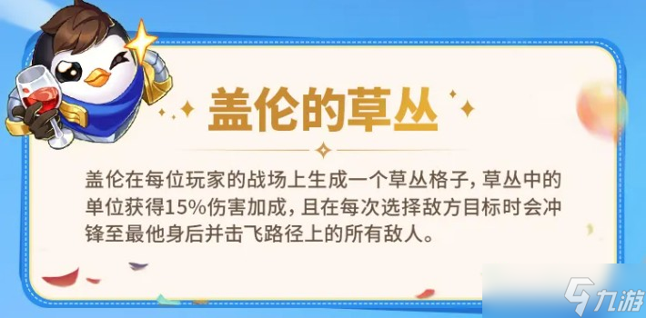 先从地区效果开始说。盖伦的草丛这个效果,会在每位玩家自己的战场上生成一格草丛,站在里面的棋子,打出的伤害提升15%。更重要的是,草丛里的单位攻击敌人时,会直接冲到对方身后,路上碰到的所有敌人都会被击飞。这个位移机制其实很有意思,配合高攻速或者范围伤害的棋子,战场空间可以利用得很充分,草丛格的落点值得好好想想。
