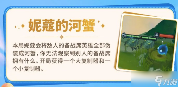 妮寇的河蟹就比较恶心了,会把所有对手的备战席英雄全部变成河蟹显示,看不出别人在攒什么阵容。开局送一个大复制器和一个小复制器,补偿还算厚道,但这局游戏基本没法参考别人的备战席来调整自己的节奏,只能靠自己排好阵容往下走。复制器的价值很高,拿到之后优先想好复什么,不要随便浪掉。