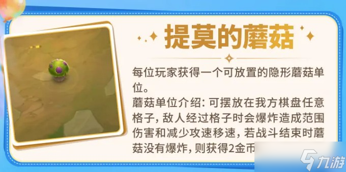 提莫的蘑菇给每个人一个可以放置的隐形蘑菇单位。蘑菇放在己方棋盘上,敌人经过时爆炸,造成范围伤害并降低攻速和移速。如果一整场战斗蘑菇都没爆,还能回2金币。这个效果不算特别强,但2金币的收益也不差,如果对面不走那一格的话白赚。摆放位置要结合对面可能的站位来判断,随便摆可能浪费。