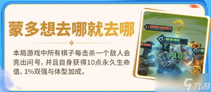蒙多的效果是全局生效的,所有棋子每击杀一个敌人会亮问号,同时获得10点永久生命值、1%双强和体型加成。叠得越多、棋子越强。这种滚雪球型的机制在前期打得越顺后期越夸张,开局多注意保持胜场,复利效果还是很明显的。