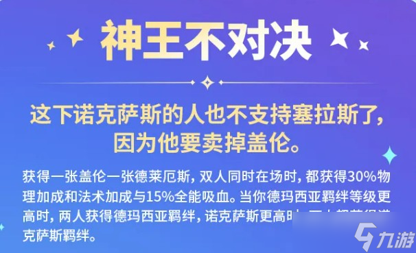 强化符文方面,神王不对决这个符文给了盖伦和德莱厄斯,两人同时在场就获得30%物理加成、法术加成和15%全能吸血,还能根据德玛西亚或诺克萨斯羁绊等级更高的一方给两人套上对应的羁绊。这种双核共存的设计比较少见,核心就是看哪边羁绊更好凑,然后往那个方向组队。
