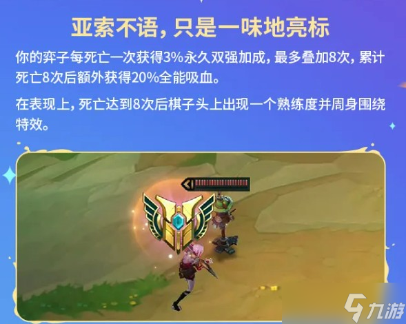 托儿索是一个死亡叠加型符文,每死一次获得3%永久双强加成,上限8次,叠满额外获得20%全能吸血,死亡8次后棋子头上还会出现特效。这个符文看起来是越死越强的路线,前期可以主动让棋子多消耗,把叠层尽量在中期补满,后期就会很暴力。