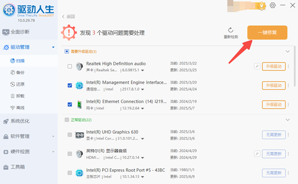 点击“升级”或“一键修复”,等待2分钟自动下载安装官方驱动;