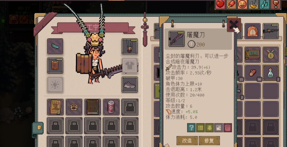 屠魔刀是一把价值200金币的近战武器,这把武器的攻击力高达39.9,这个攻击力在近战武器中可以说是比较高的存在了,而且武器的攻击频率也非常的快,每秒钟可以攻击2.93次,能够带来30点的破甲值,在装备上屠魔刀以后,角色的体力上限还会增加10点,击退距离为1.2迷,使用400次以后需要玩家进行维修,每使用一次屠魔刀以后会消耗掉玩家5点的体力值,移动速度会增加5%,攻击数量为6,从屠魔刀的各方面属性,不难发现这把武器真实的非常不错,最重要的是屠魔刀能够合成暗夜屠魔刀。