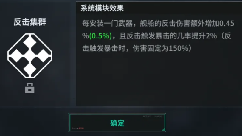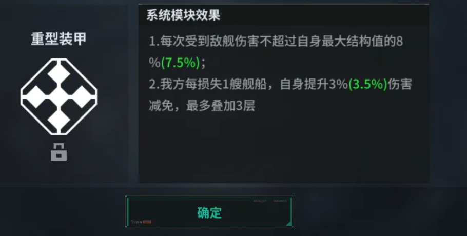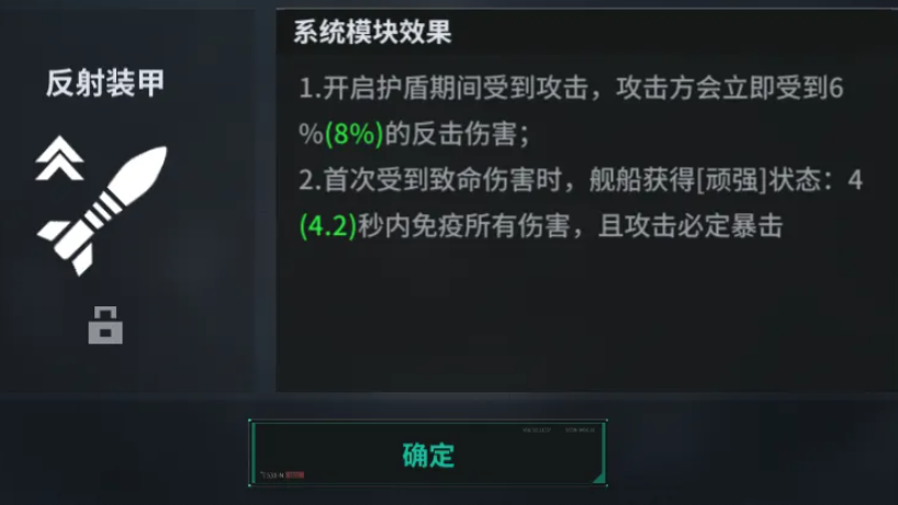 飓风级模块二为反射装甲,以牙还牙战术思想得到极致的运用。开启护盾期间受到攻击的时候,攻击方就会立即受到反击伤害。受伤反击的特性使任何一个敢于集中火力对付它的敌人都要掂量三分。更霸道的是,当飓风级第一次受到致命伤害的时候,它就会获得“顽强”状态,在数秒内免疫所有的伤害,并且攻击一定会暴击。被摧毁之前所具有的锁血爆发能力,是该战舰常常可以产生反杀残局的奇迹,这也是绝境逆转的关键所在。