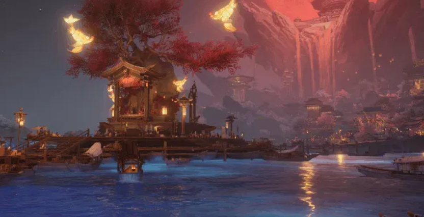 为了匹配这种包容度诡市纵向分为了三大区域,分别是叱罗、平原市集和水下世界,此外还有环绕散落的悬空浮岛,在这样立体的地图中移动,自然也需要多重交通方式,生财钩、摇橹飞舟等交互方式可以帮助大家尽情穿梭,在山体背面的月影区繁盛的紫藤树孕育灵力,等待路人前来相谈。