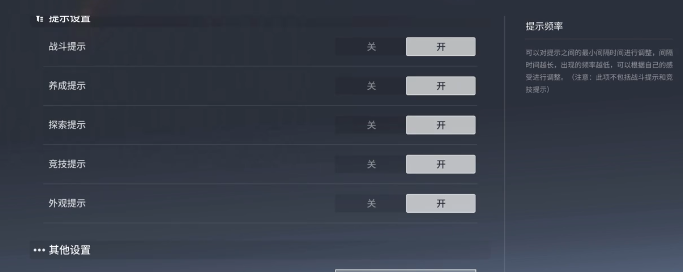 最后自然就是灵宝设置,这就是新手探索的小助手。在游戏中就会提示战斗的技巧,还有附近的资源点。新手玩家就可以把提示的频率调高一些,一开始对于地图或者是玩法不熟悉,那么频繁的提示,就可以让大家更好的掌握战斗的思路。轻松的找到宝箱,还有材料等资源,可以少走弯路,迅速的熟悉游戏机制。等到熟练之后,然后根据需求去降低提示的频率,不会影响到大家在探索时的自由度。