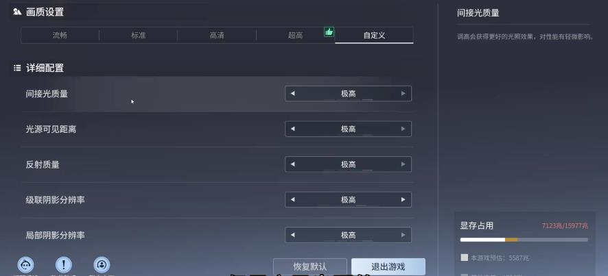 锐化数值建议设在10到30之间,不用拉太高,拉高了画面反而会有点奇怪。间接光质量选极高,阴影选高。材质细节、纹理质量、模型质量这几个选项,条件允许的话全部拉到最高,画面细节会好很多,看起来更真实一些。