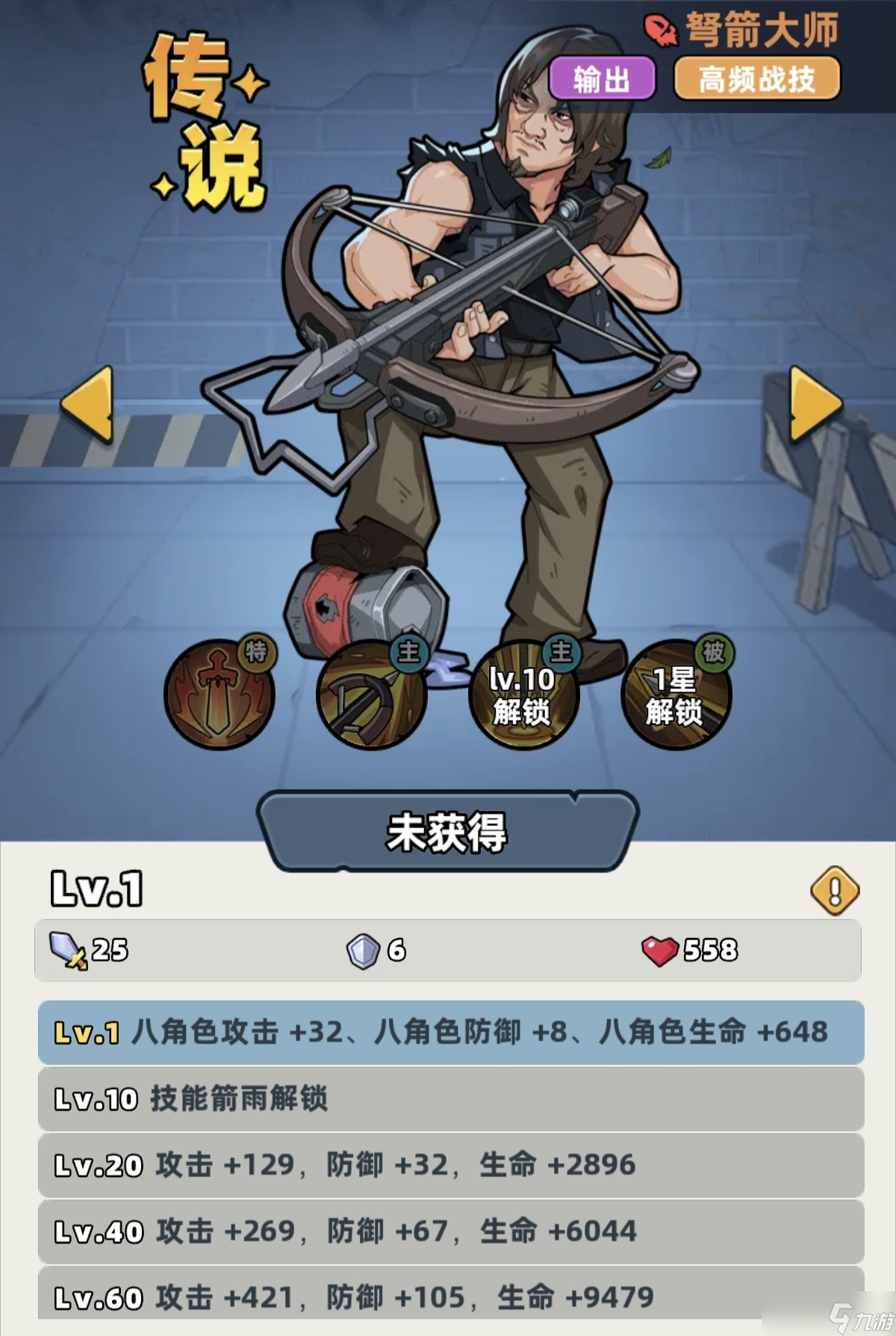 生存33天弩箭大师介绍,这个传输级别的角色怎么获取,在丧尸横行的时代,你可以看到这个使用弩箭的输出手段,轻松的来帮助你去战斗,一起来看看吧。