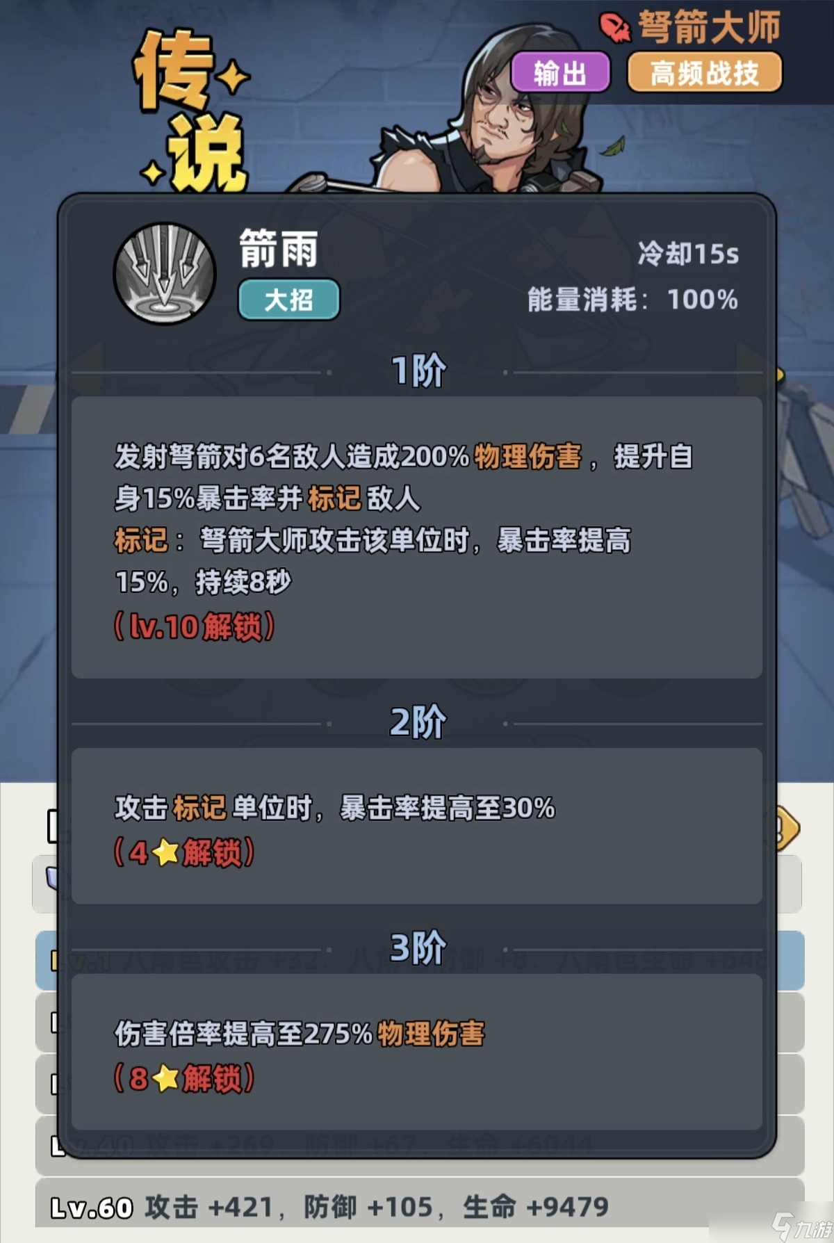弩箭大师是传说品质,作为主力输出在前期是够用的。对于平民玩家来说,更是因为自身容易获得所以更好养成,容易提高到高星级解锁更多被动。他擅长的是高频率释放战斗技能。