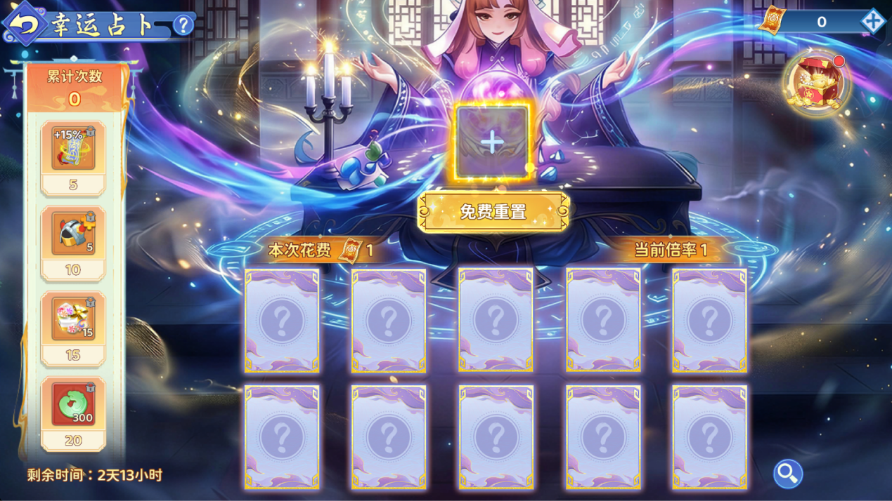 占卜中途可消耗幸运奖券重置本轮,本轮翻开的塔罗牌越多,重置消耗越少。