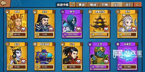 上阵:蛇女,火灵,萌萌,水灵,潜艇,射线,虎弓,骨弓,冰精灵,土灵,