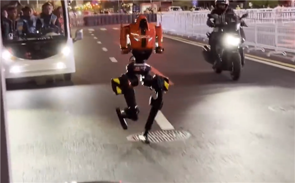 从关海涛转发的视频显示,机器人“闪电”上身主体颜色为橙色,机身前后分别印着HONOR、荣耀标识,在灵活转过一个大弯后,闪电立刻开始全力提速,几乎要超越先于它出发的选手。
