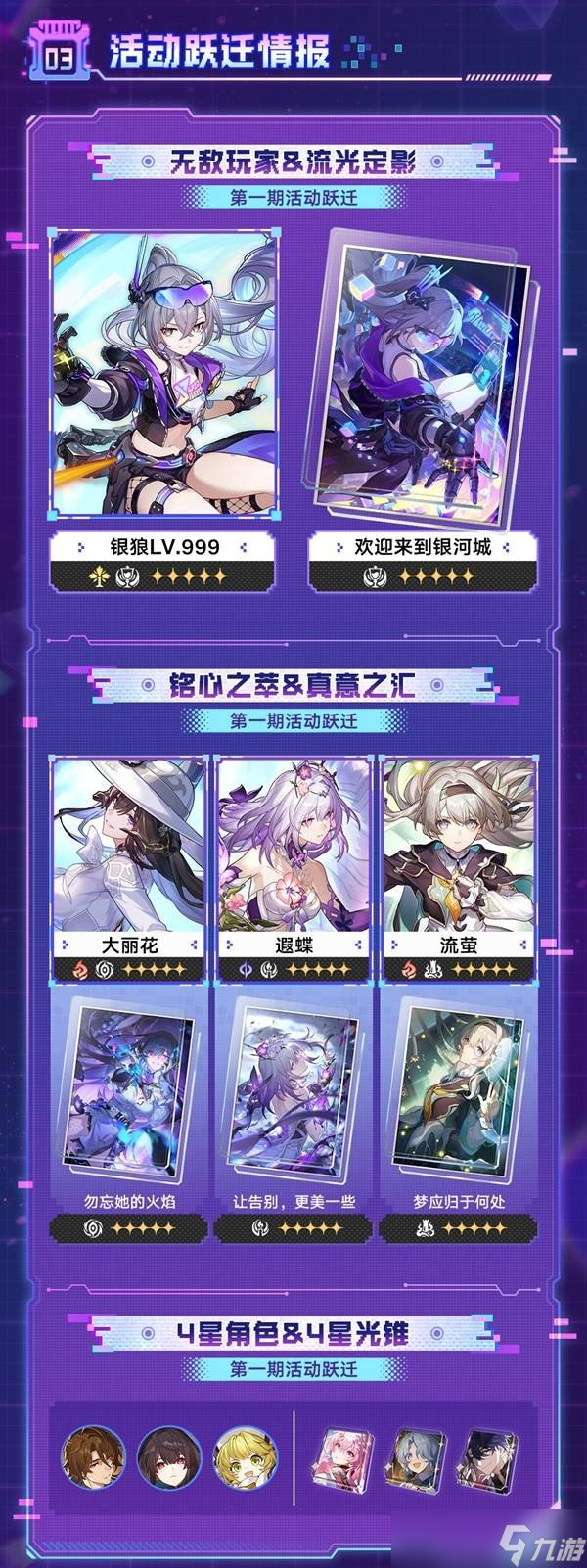 新角色:上半卡池推出银狼 LV.999(五星?虚数?欢愉),下半卡池推出绯英(五星?物理?欢愉)。此外,开拓者将解锁全新 “欢愉” 命途,为雷属性角色,可双持光剑与应援棒。