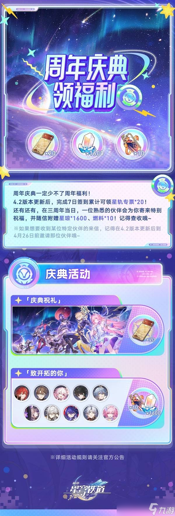 崩坏星穹铁道三周年庆典将在4.2版本正式开启,周年庆活动期间,官方将送出实体纪念册,游戏内还将上线海量福利活动。玩家参与周年庆活动就可获取五星角色自选、星琼通票等奖励。那么下面为大家带来周年庆福利汇总。
