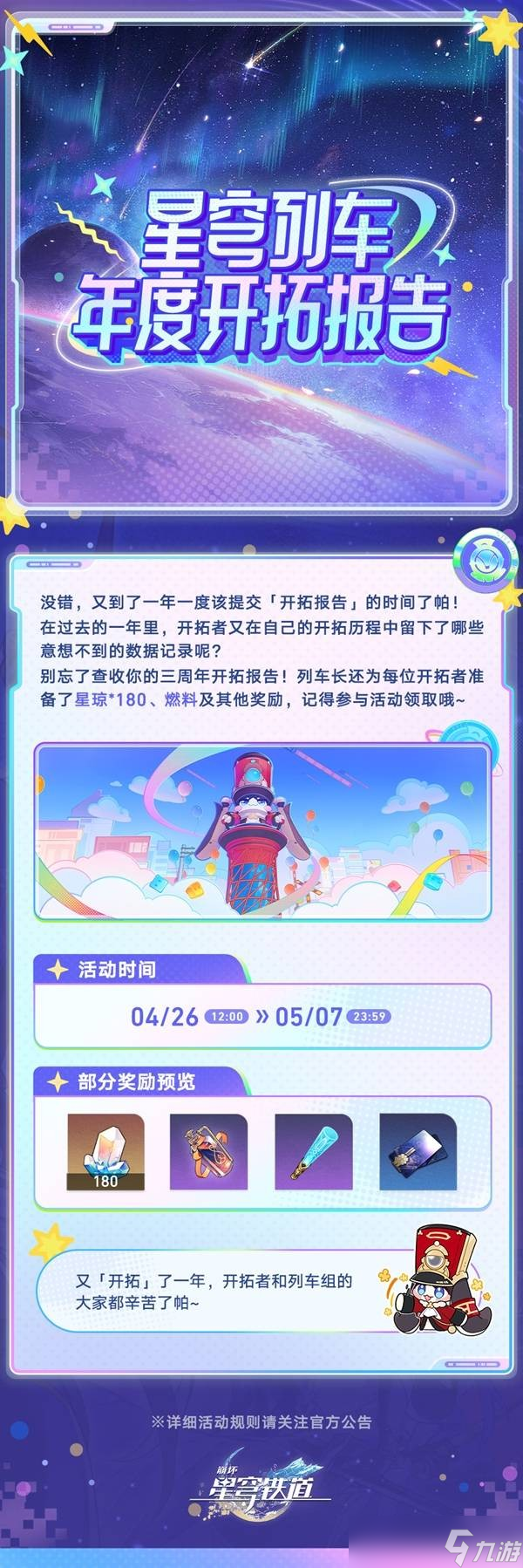登录与签到福利:签到 7 天可领20 张星轨专票。4 月 26 日周年庆当天,邮件发放 1600 星琼与 10 管燃料。