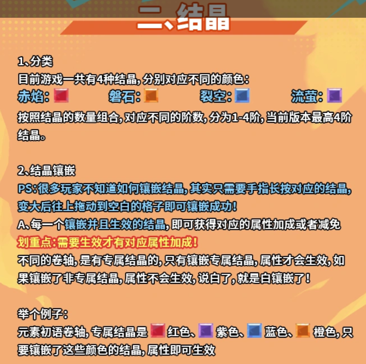 魔法卷轴系统内设四类基础属性结晶,严格对应颜色与功能:赤焰结晶(红色)、磐石结晶(橙色)、裂空结晶(蓝色)、流萤结晶(紫色)。每种结晶仅适配特定颜色标识的卷轴——例如赤焰之书仅接受赤焰结晶,若误镶其他色系,不仅属性无效,图标还将置灰,导致材料浪费。该系统采用4阶结构设计,即红、橙、蓝、紫四色结晶数量总和决定当前卷轴所处阶数。操作方式为长按结晶图标使其放大,再拖入卷轴对应空白镶嵌位完成装配。