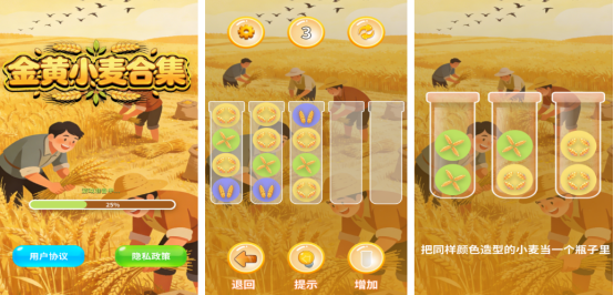 以田园治愈风格为基调,呈现小麦从萌芽到成熟全过程的视觉演进。核心玩法为颜色归类解谜:初始界面随机分布多色麦粒于若干容器中,玩家需通过有限次数的滑动操作,将同色麦粒归入同一容器完成通关。关卡难度梯度清晰,前期侧重基础规则理解,后期引入多重约束条件,强化空间推理能力。