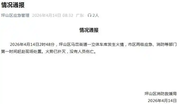 2026年4月14日2时48分,坪山区马峦街道一立体车库发生火情,市区两级应急、消防等部门第一时间赶赴现场处置。火势已扑灭,没有人员伤亡。