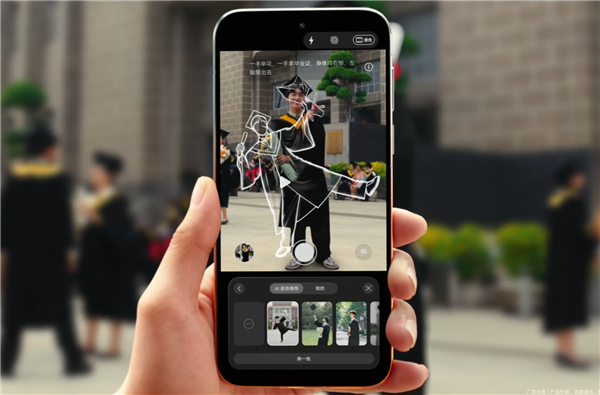 例如在毕业照场景中,开启该功能后,手机会直接给出完整动作指引:一手举花,一手拿毕业证,身体向右倒,左脚踢出去,帮助用户轻松摆出更自然、更上镜的姿势。