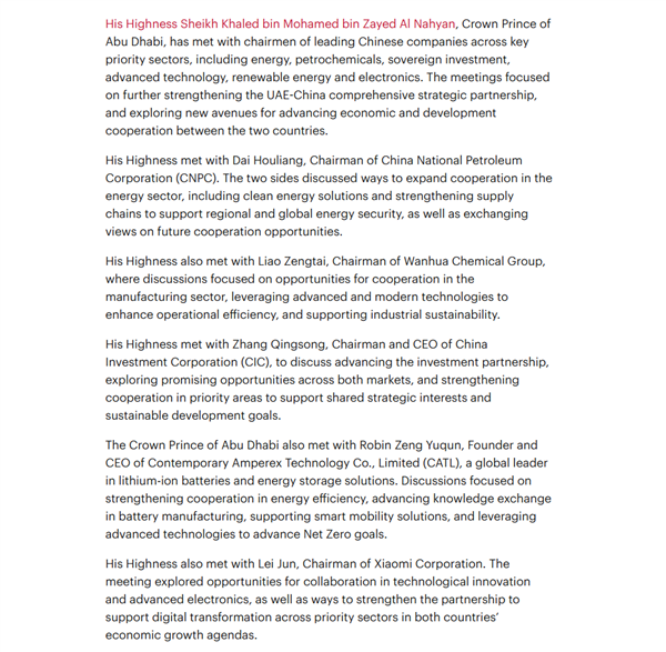 阿联酋阿布扎比王储访华 会见雷军、曾毓群等企业家