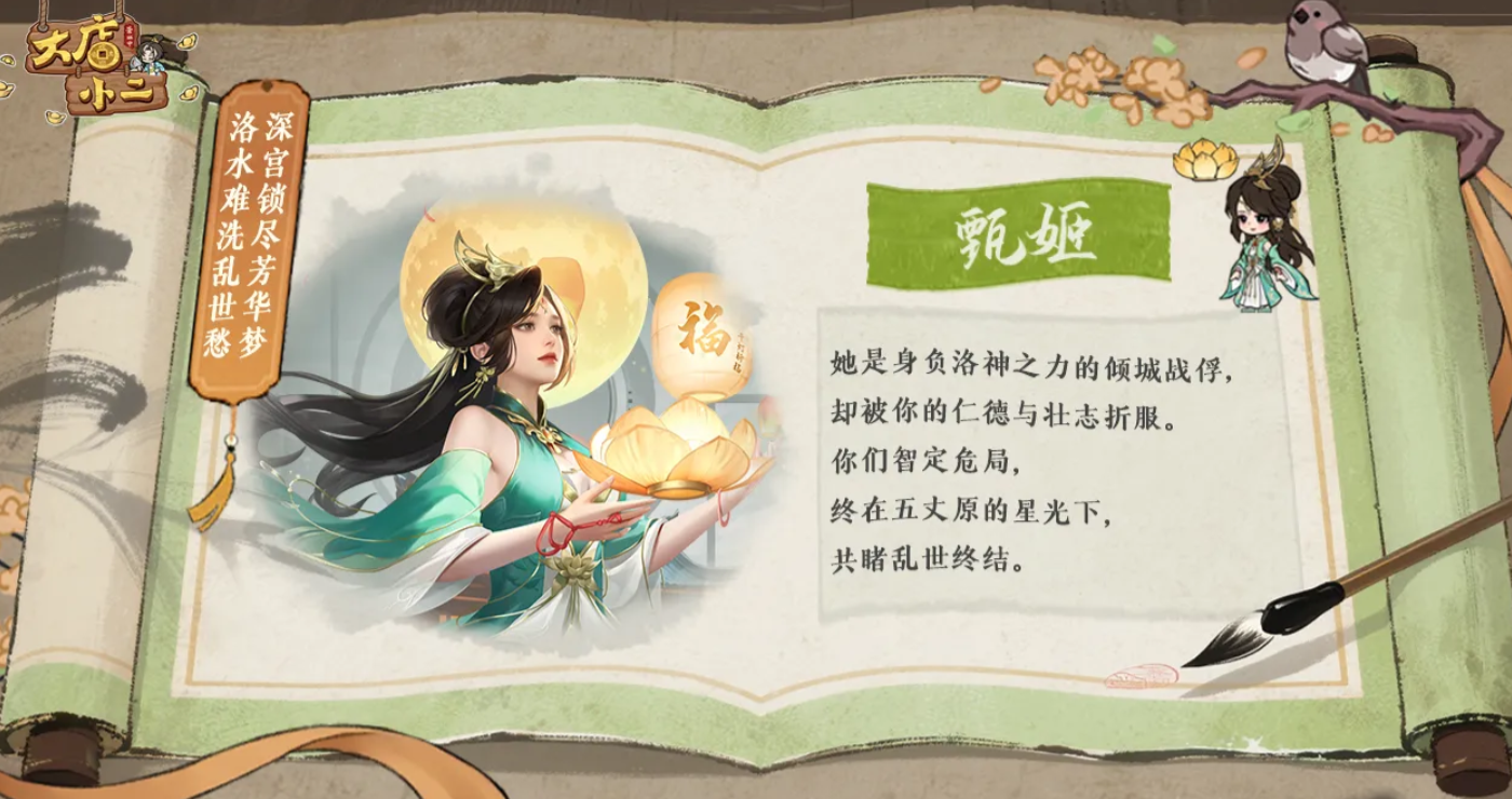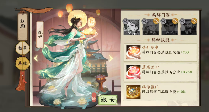 其一为【秀外慧中】:当甄姬与任一羁绊门客共同在店时,该门客全属性(含攻击、防御、速度、经营、服务等)基础数值统一提升200点。此加成为固定值,适配性强,可有效弥补门客成长短板;其二为【蕙质兰心】:在羁绊生效前提下,甄姬为全体门客提供全属性0.25%的百分比加成。虽单次增幅有限,但随门客数量增加及天赋叠加,整体收益可观;其三为【福泽盈门】:所有在店任职的门客,服务费额外提升10%。该效果直接强化经营流水转化率,是提升长期赚速的关键路径。