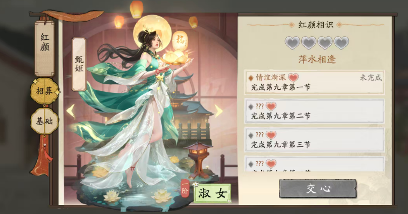 以洛水神女甄姬为例,她是第九章专属主线红颜,属于中后期开放角色。玩家完成第九章全部主线任务后,甄姬将正式入驻内宅。此时她虽不可上阵参战,却可通过“红颜羁绊”机制,与特定门客协同产生多重经营增益。当前可激活羁绊的门客包括姜子牙、包拯、张飞与毕升四人,搭配后可触发三项专属技能效果。