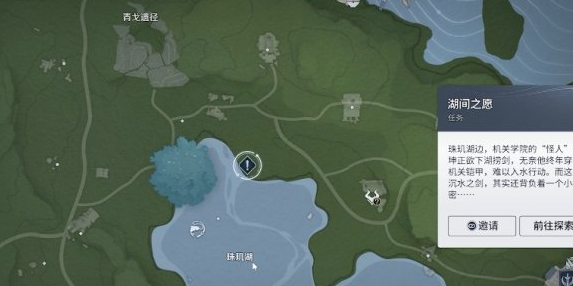 任务起点位于一处传送锚点。抵达后向西眺望,可见湖畔伫立一名身披厚重机关铠甲的角色——他凝视水面,神情焦灼。靠近对话得知:其珍视的专属武器意外沉入湖底,因铠甲负重过大无法下潜,只能守候岸边。此时任务正式触发,玩家需跃入水中,沿柔和水光与动态光标引导潜行,逐步接近湖床深处的目标物品。