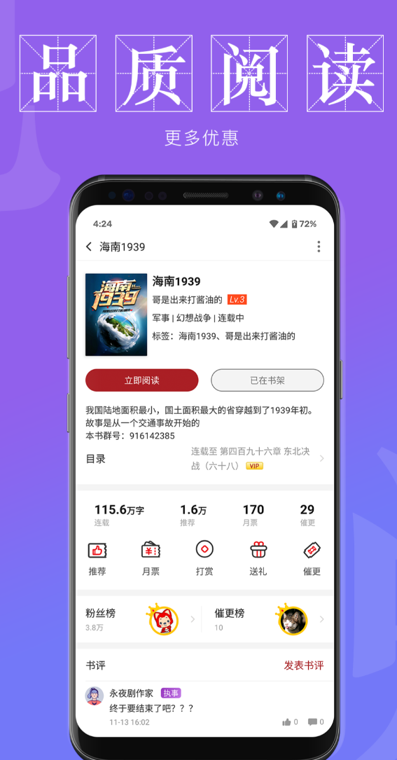 主打硬核现实题材,军事、历史、谍战、工业流、技术流等内容占据核心品类。作者团队中不乏具备专业背景的从业者或研究者,保障了文本的史料严谨性与叙事纵深感。创新“章说”功能将读者短评锚定至具体段落旁侧,降低表达门槛;部分热门作品开放剧情共创机制,读者可通过投票影响关键情节走向,显著强化阅读过程中的主体性与代入深度。