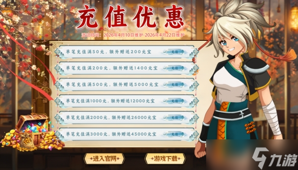 活动期间,单笔充值达到指定额度,即可获得额外元宝。每一份投入,都有加倍回报!