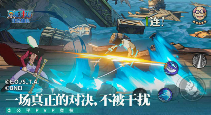 战斗系统是魔方工作室的老本行了。他们之前做过火影忍者手游,这次把动作格斗经验用到航海王上。游戏有经典的3V3模式,PVP竞技不吃数值,靠的是操作和意识。瓦波尔、里奇船长、斯摩格这些角色在竞技场里各有特色。还加了援护技、空岛贝、终结技、飞行道具这些玩法,立回博弈比较讲究。像路飞和索隆的友情援护技,东利和布洛基的霸国,都是原作里的经典桥段。
