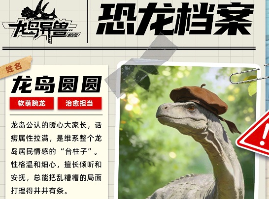 第二只强推的恐龙是龙岛圆圆,作为一只腕龙是团队当中的智力担当,也是每一个龙岛小伙伴公认的大家长,虽然具备话痨属性,但却是整个龙岛情感居民联系的台柱子,最擅长的是与每只恐龙进行沟通,并且能够安抚倾听他们的心事,爱好就是收集地上可以发光的鹅卵石,在战斗过程当中能够为团队提供持续的续血量,保证整个团队的续航时间。