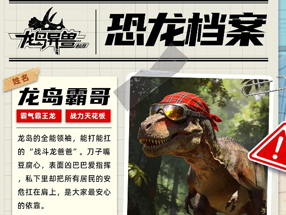 第三个恐龙是霸王龙,有不少玩家将其戏称为龙岛霸哥,作为龙岛上的全能领袖,不仅是战力值天花板,而且还具备一定的坦克属性,能够扛下不小的伤害。虽然在恐龙岛上他表面凶狠,但私下里却关注着每一位居民的安全,而且拥有这只霸王龙后,还可以对其他年轻的异兽进行训练,完成战力值天花板的提升,所以在游戏当中这个恐龙角色不可或缺。