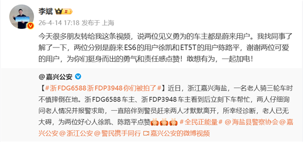 对此,蔚来汽车创始人李斌发文:今天很多朋友转给我这条视频,说两位见义勇为的车主都是蔚来用户。