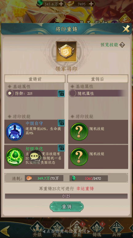 铜钱与玉玺是贯穿整个新手期的战略性资源。玉玺广泛用于商城兑换时装、战法、勋章等关键养成内容;铜钱与玉玺共同构成将印重铸系统的消耗基础。该系统可直接突破武将基础属性上限,对战力成长影响显著,务必重视两类资源的长期规划与合理留存。
