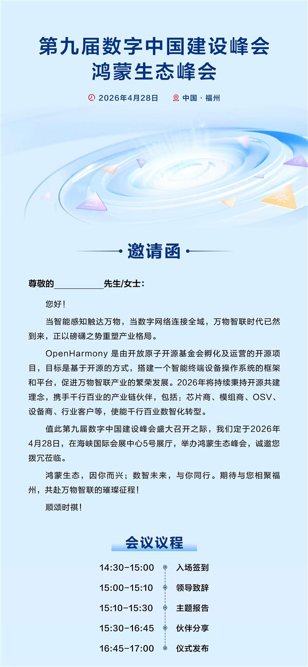 万物智联时代加速到来,操作系统正成为连接数字世界与产业升级的关键底座。4月28日,在第九届数字中国建设峰会召开之际,鸿蒙生态峰会(以下简称“峰会”)将在福州海峡国际会展中心5号展厅正式举行。一场聚焦开源鸿蒙生态演进与产业协同的重磅活动即将拉开帷幕,现诚邀各界关注。