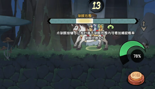 驯服并非纯概率事件,而是一套融合时机判断与策略准备的交互流程。进入森林场景后,锁定目标灵兽将自动触发驯服界面,界面中央会出现一条动态进度条,其上光标以固定频率左右往复滑动。系统默认提供5次手动干预机会——当光标移入高亮判定区间(即“最佳驯服窗口”)时,及时点击即可为本次驯服成功率提升2%。若5次全部精准命中,累计加成达10%,显著拉高整体成功率下限。