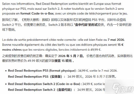 据介绍,《荒野大镖客:救赎》将分别推出PS5和Switch 2的实体版本。不过需要注意的是,Switch 2版本将采用“盒装下载码”(Code-in-a-Box)的形式,仅包含游戏下载代码。