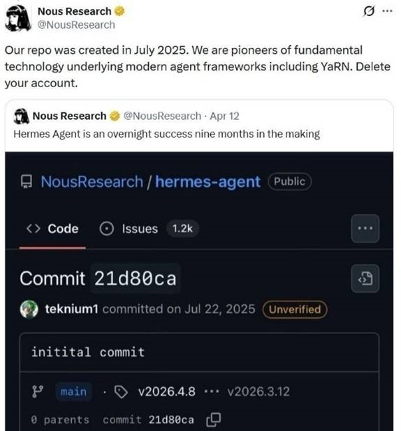而Hermes Agent的开发团队,硅谷知名AI实验室Nous Research的官方账号也很快做出了相当强势的回应,称“我们的仓库2025年7月就有了。我们是‘先驱’。删除你们的账号。”